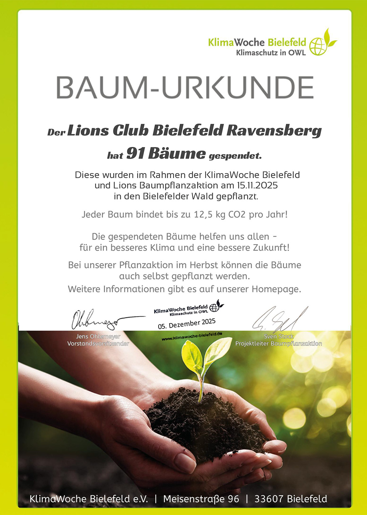Der Lionsclub Bielefeld Ravensberg hat sich erfolgreich an der Baumpflanzaktion der KlimaWoche Bielefeld beteiligt. Zahlreiche Mi